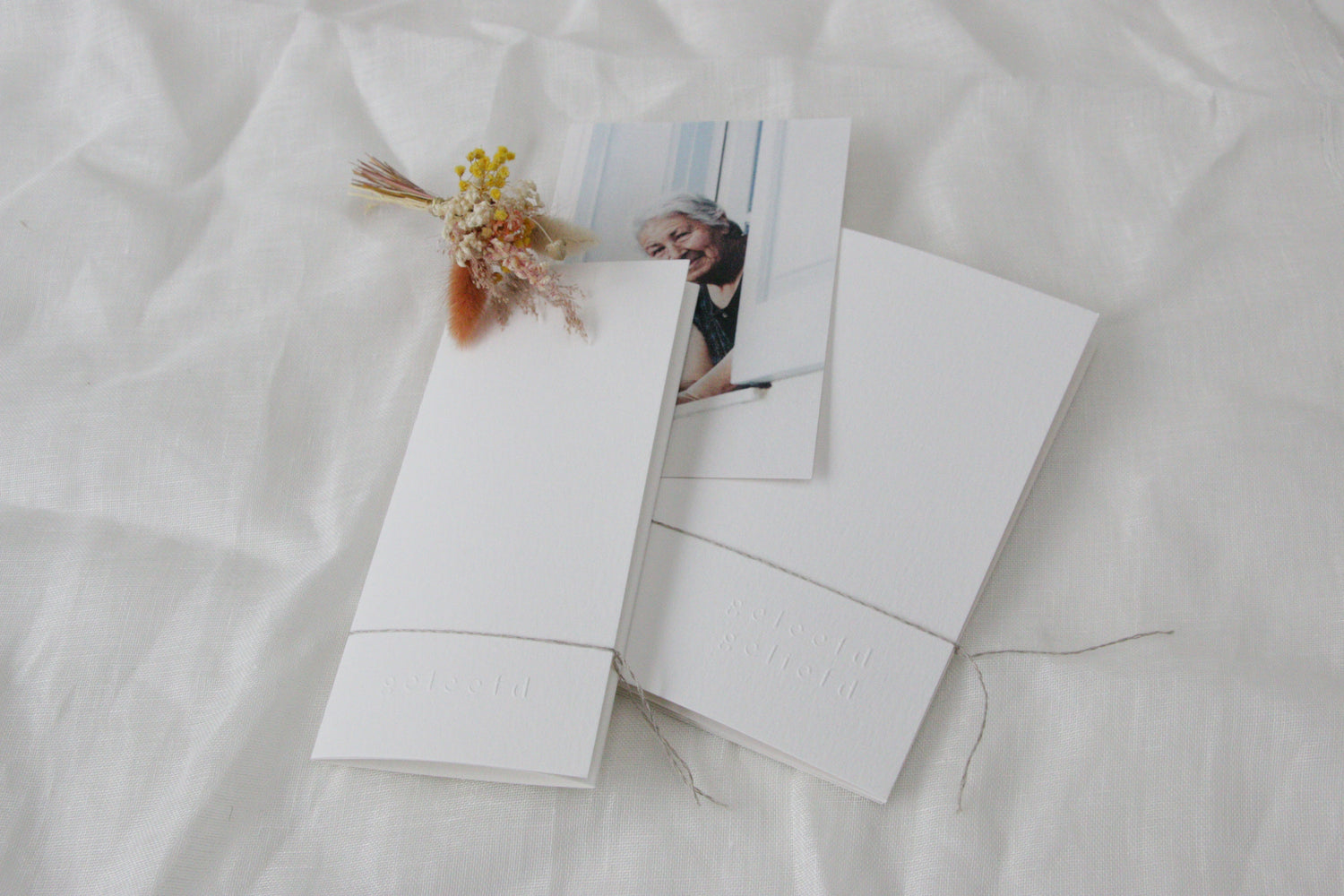 De ceremonieboekjes hebben een kaft uit ecologisch katoenpapier met de titel ‘Geleefd, Geliefd’ in blinddruk. Binnenin drukken we op prachtig 100% gerecycleerd papier. De boekjes zijn hand gebonden met garen.
