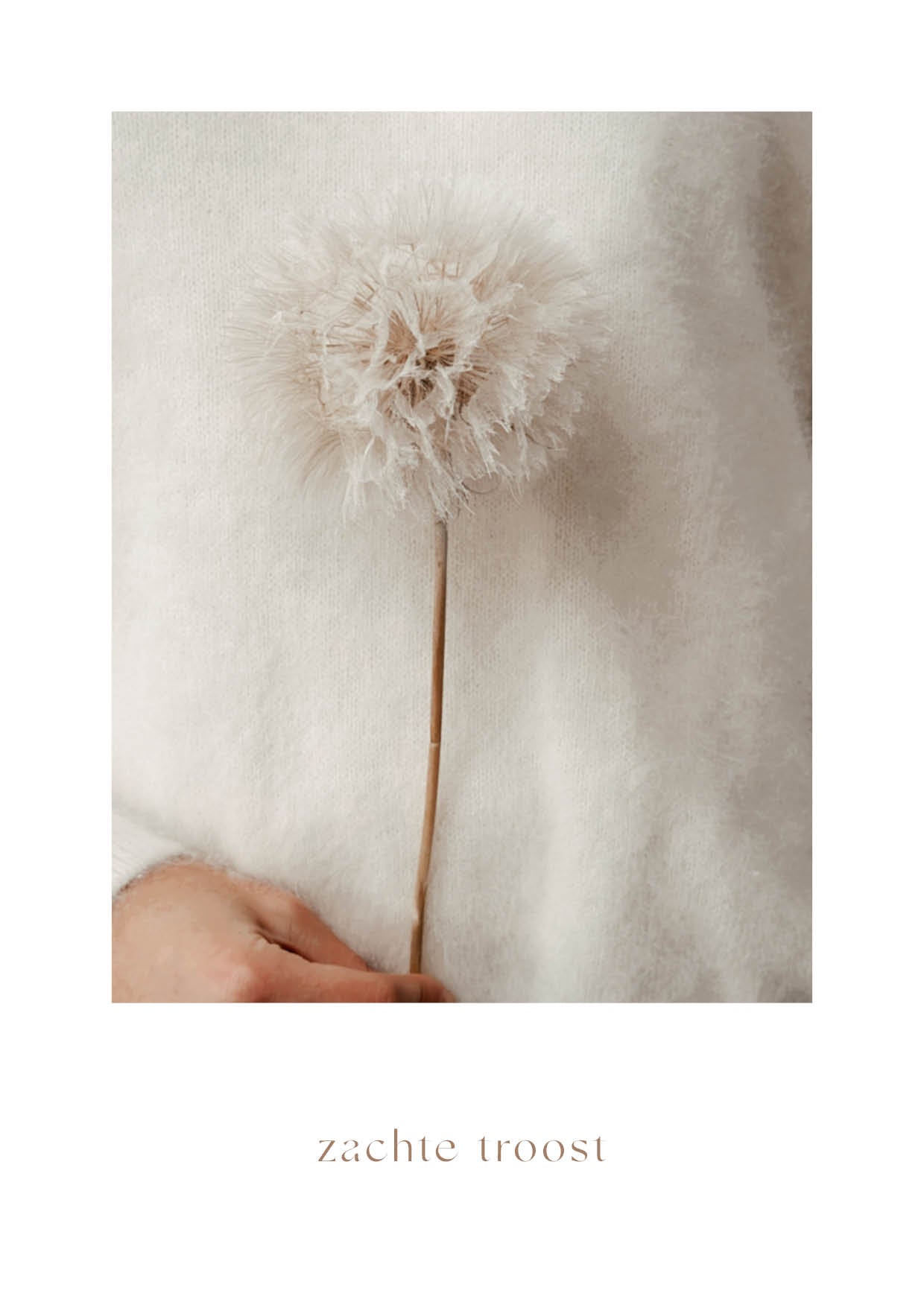 Zachte troost is er voor momenten waarop woorden tekortschieten. De afbeelding en de korte tekst brengen rust, zachtheid en een stille vorm van steun.